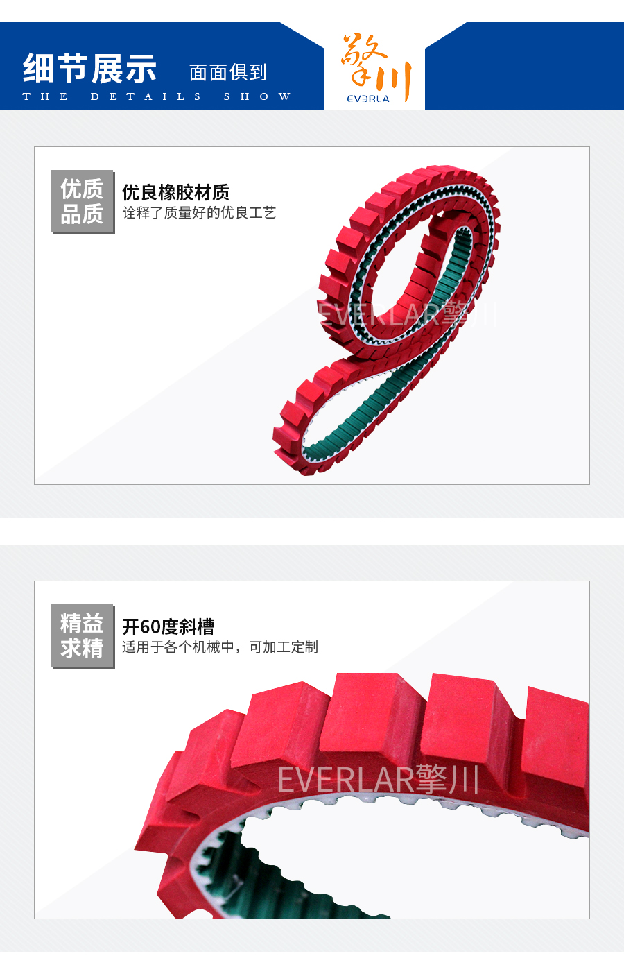 皮帶表面加耐磨橡膠,增加皮帶表面的耐磨性能及增加摩擦力,并且具有一定的彈性,同時(shí)可以提高皮帶的耐用性,表面橡膠顏色有紅色、綠色、藍(lán)色、白色等。還可在夾瓶機(jī)皮帶表面加海綿,加PVC花紋,加PU膠及各類彈性體;可開槽,加擋塊,加導(dǎo)向條,打孔;EVERLA擎川可根據(jù)客戶需要,制造各類異型機(jī)械傳動(dòng)帶。