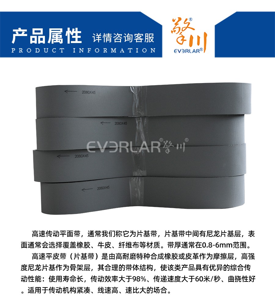 高速平皮帶(片基帶)是由高耐磨特種合成橡膠或皮革作為摩擦層,高強(qiáng)度尼龍片基作為骨架層,其合理的帶體結(jié)構(gòu),使該類(lèi)產(chǎn)品具有優(yōu)異的綜合傳動(dòng)性能:使用壽命長(zhǎng),傳動(dòng)效率大于98%、傳遞速度大于60米/秒、曲撓性好。適用于傳動(dòng)機(jī)構(gòu)緊湊、線(xiàn)速高、速比大的場(chǎng)合。