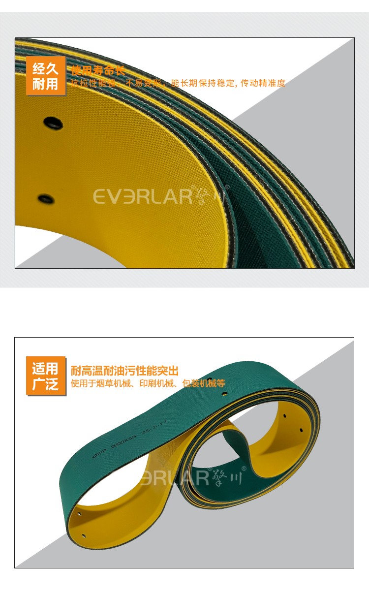 產(chǎn)品名稱:黃綠片基帶加打孔低噪音抗撕裂印刷紡織包裝行業(yè)高速傳動(dòng)帶
