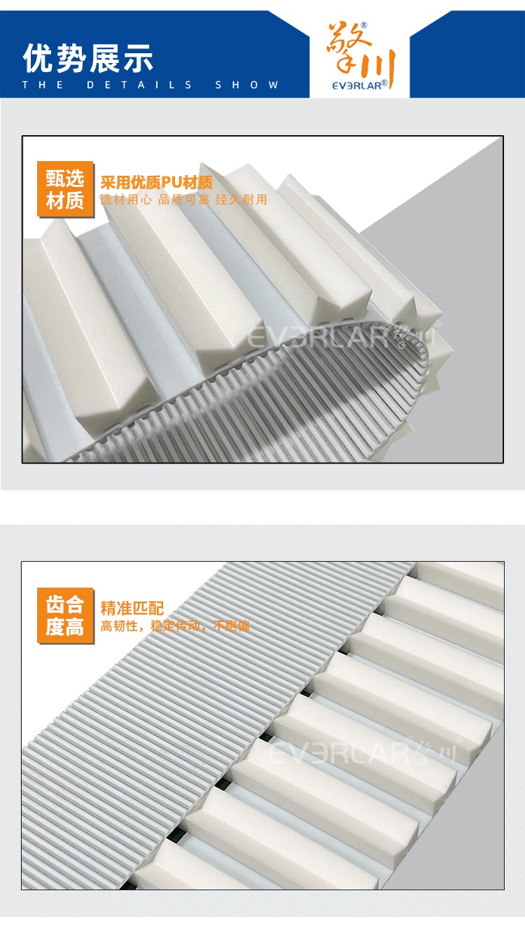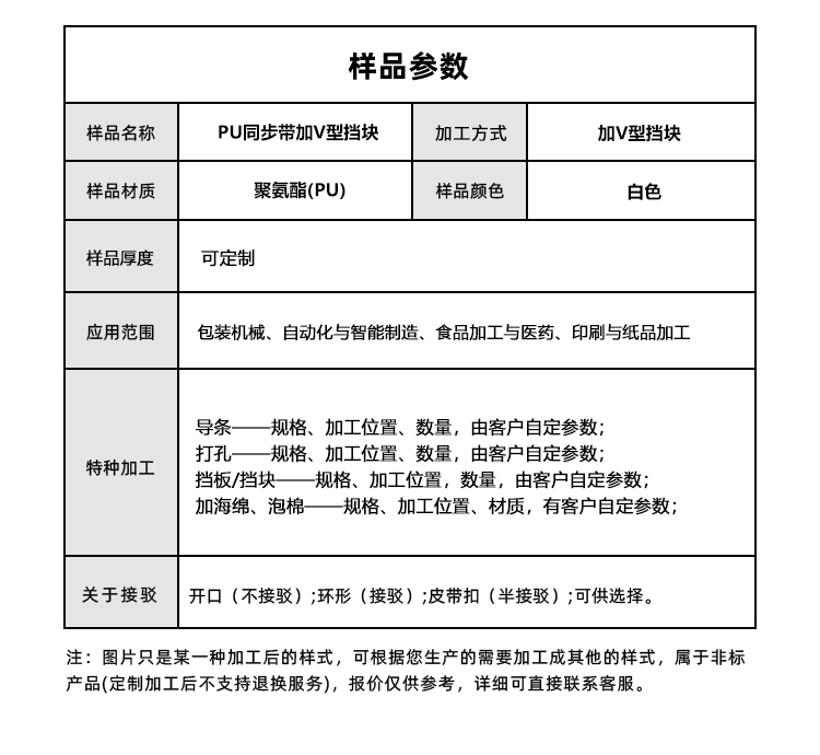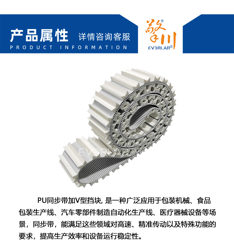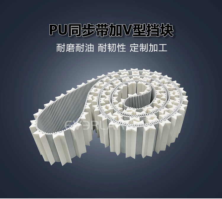 產(chǎn)品名稱:PU同步帶加V型擋塊食品包裝生產(chǎn)線工業(yè)傳動(dòng)帶定制