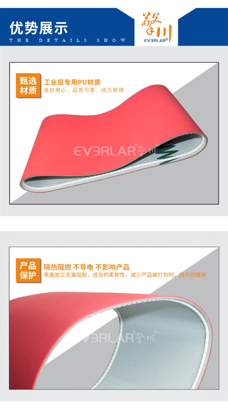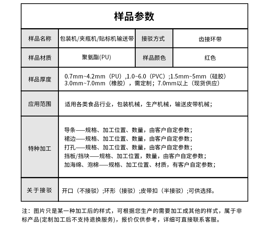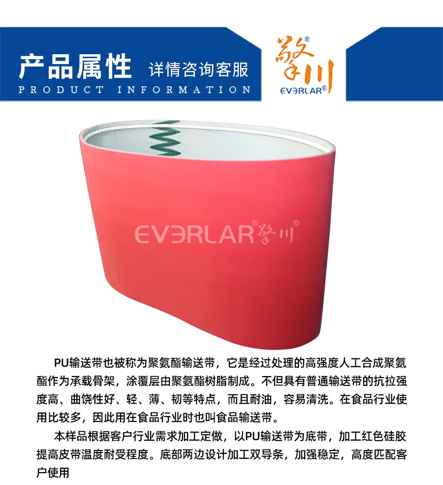本樣品根據(jù)客戶行業(yè)需求加工定做,以PU輸送帶為底帶,加工紅色硅膠提高皮帶溫度耐受程度。底部兩邊設計加工雙導條,加強穩(wěn)定,高度匹配客戶使用。