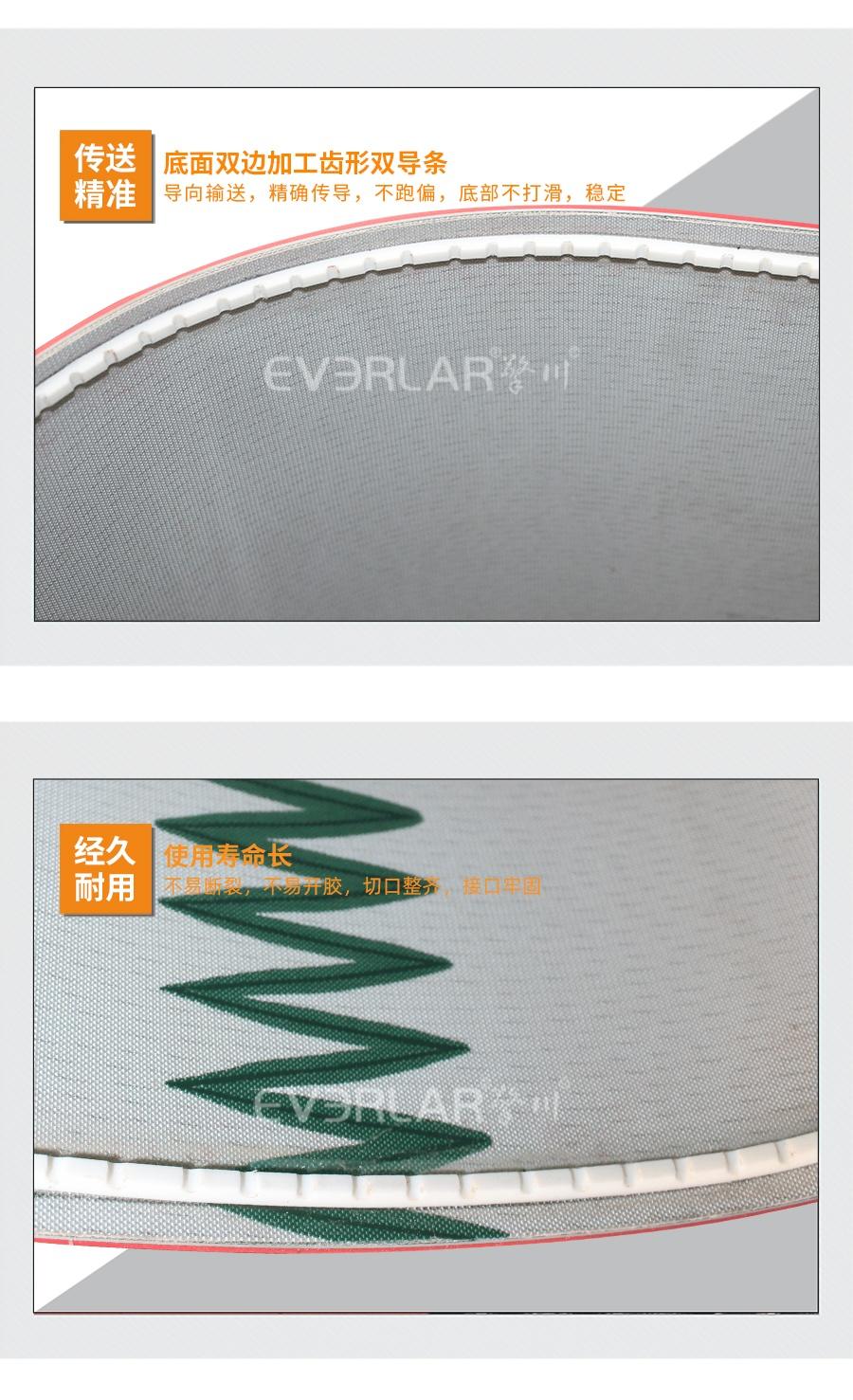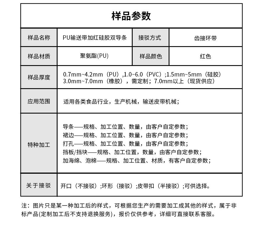 | 樣品名稱 | PU輸送帶加紅色硅膠雙導(dǎo)條 | 接駁方式 | 齒接環(huán)帶 |