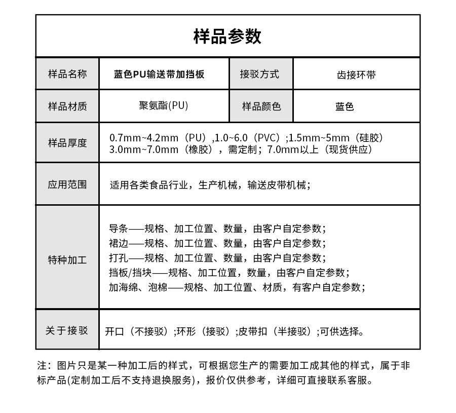 | 樣品名稱 | 藍(lán)色PU輸送帶加擋板 | 接駁方式 | 齒接環(huán)帶 |