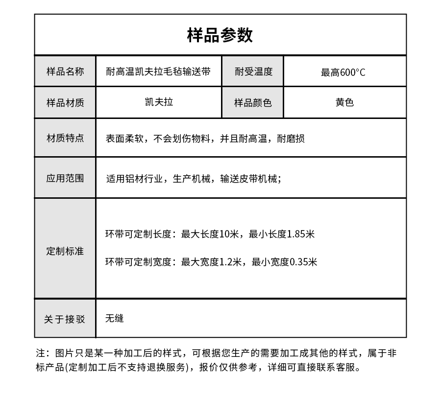 樣品名稱耐高溫凱夫拉毛氈輸送帶接駁方式