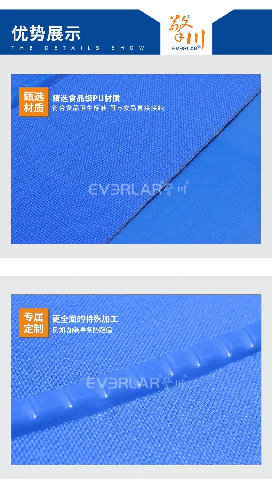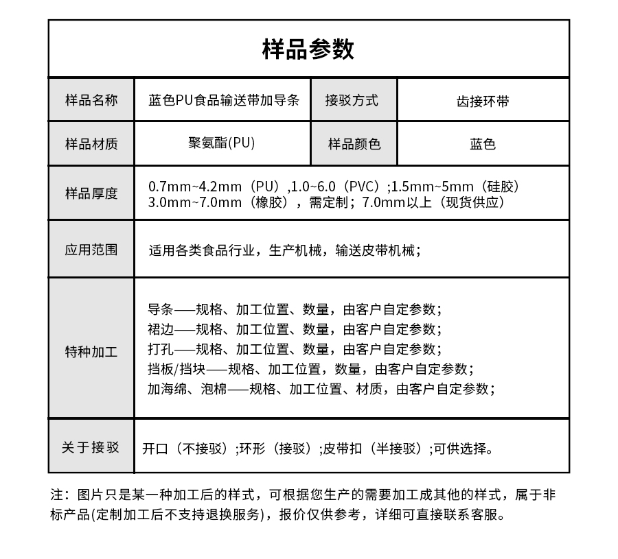 | 樣品名稱 | 藍色PU食品輸送帶加導條 | 接駁方式 | 齒接環(huán)帶 |