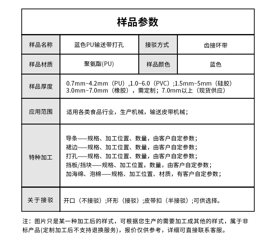 | 樣品名稱 | 藍(lán)色PU食品輸送帶打孔 | 接駁方式 | 齒接環(huán)帶 |