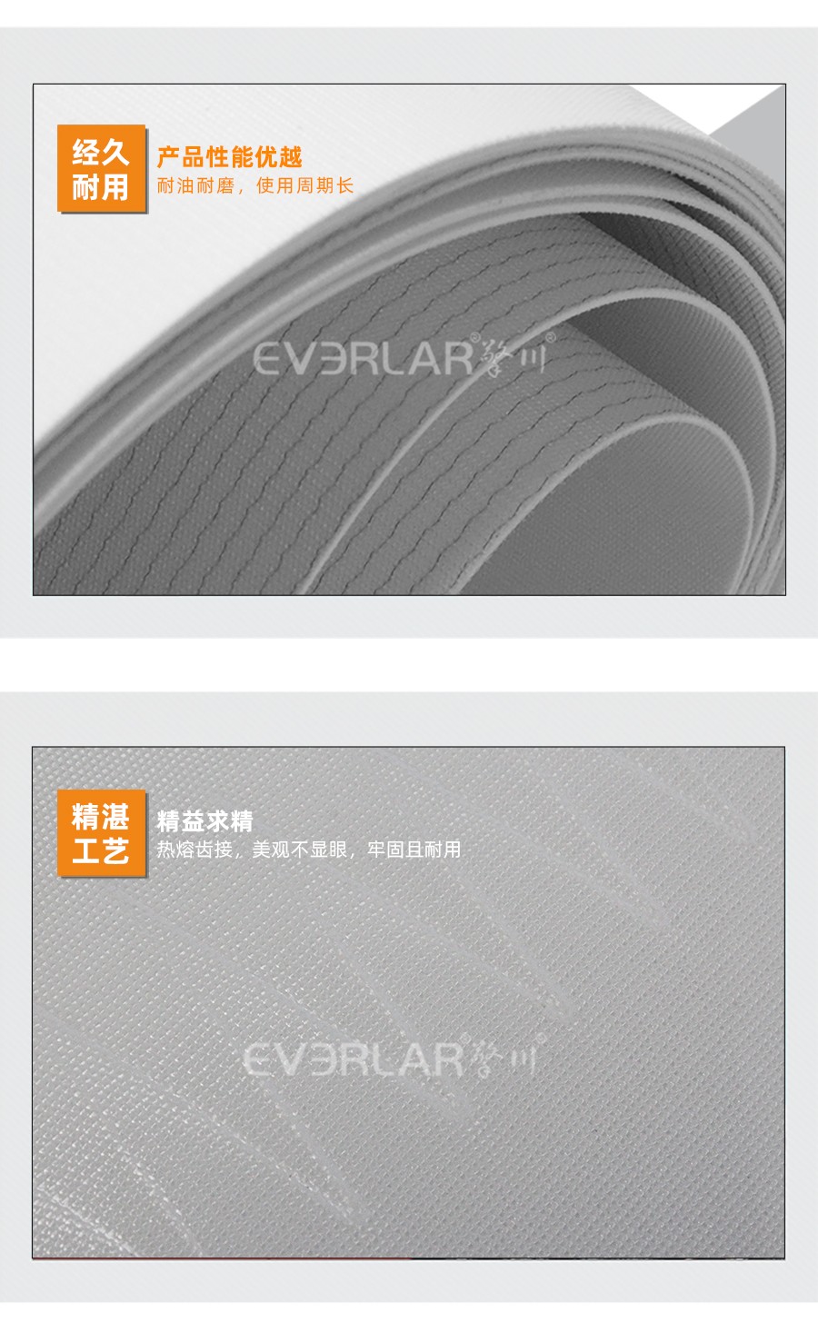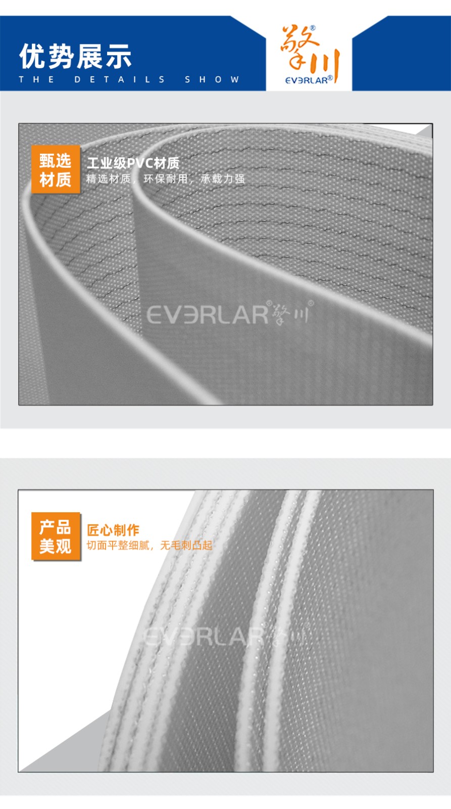 本樣品為PVC雙面纖維輸送帶,具有耐油的作用,摩擦系數(shù)大。我司的輸送帶長度和寬度可根據(jù)客戶要求定制,另外可根據(jù)客戶需求對(duì)輸送帶進(jìn)行特殊加工,例如加導(dǎo)條,加擋板、擋塊及裙邊等。