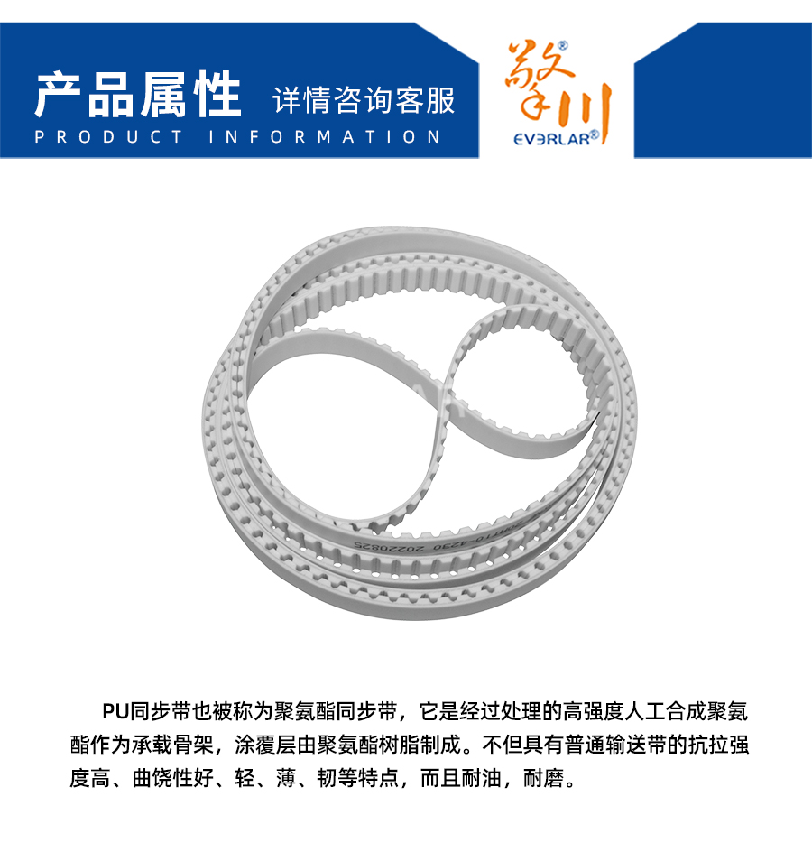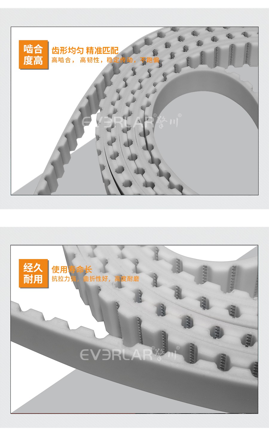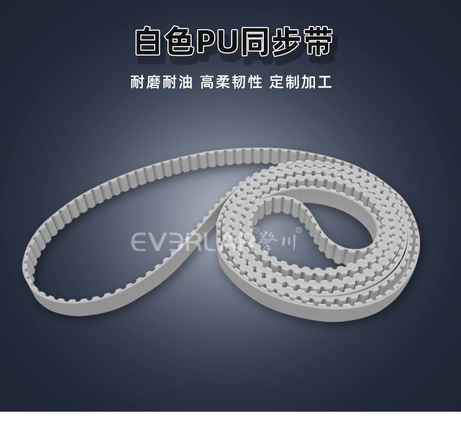 PU同步帶也被稱為聚氨酯同步帶,它是經(jīng)過(guò)處理的高強(qiáng)度人工合成聚氨酯作為承載骨架,涂覆層由聚氨酯樹(shù)脂制成。不但具有普通輸送帶的抗拉強(qiáng)度高、曲饒性好、輕、薄、韌等特點(diǎn),而且耐油,耐磨。