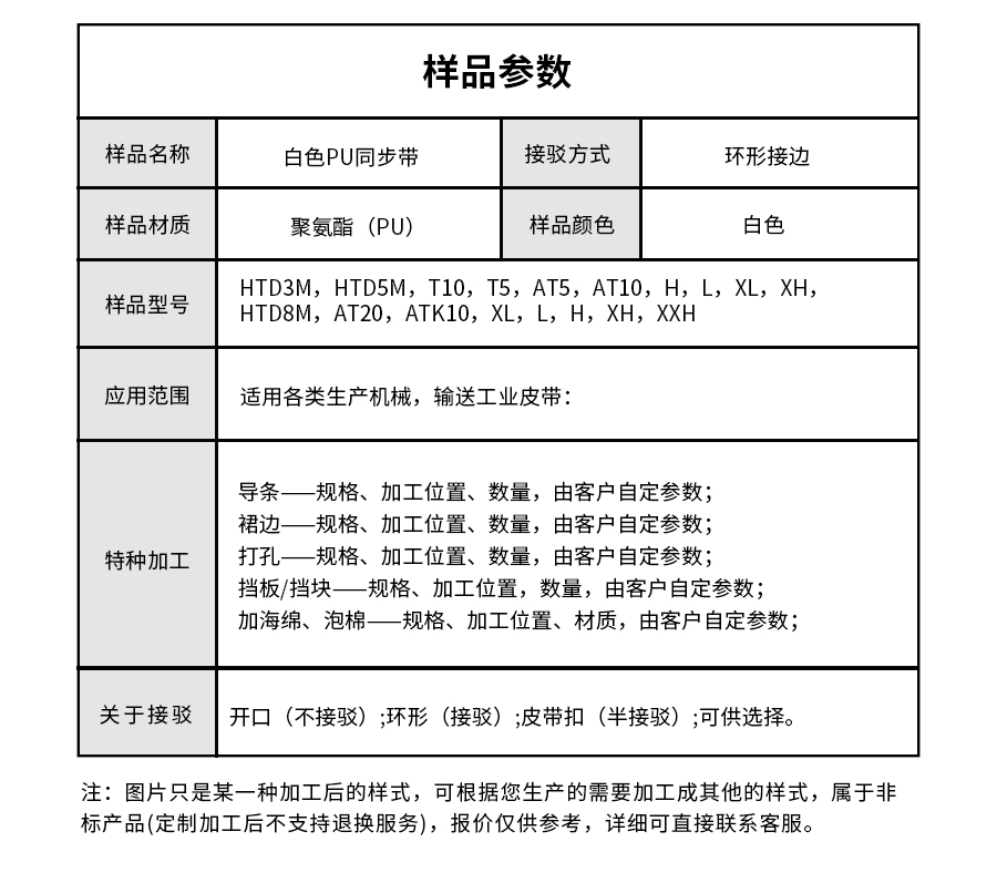 | 樣品名稱 | 白色PU同步帶 | 接駁方式 | 環(huán)形接邊 |