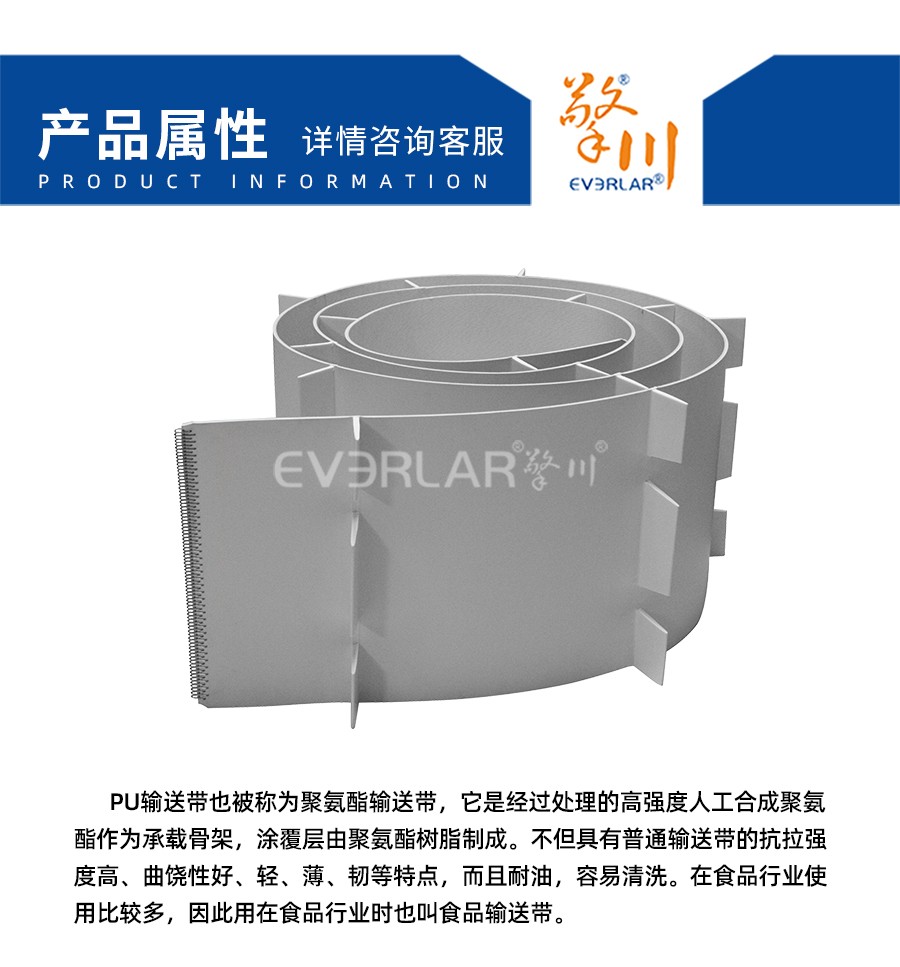 PU輸送帶也被稱為聚氨酯輸送帶,它是經過處理的高強度人工合成聚氨酯作為承載骨架,涂覆層由聚氦酯樹脂制成。不但具有普通輸送帶的抗拉強度高、曲饒性好、輕、薄、韌等特點,而且耐油,容易清洗。在食品行業(yè)使用比較多,因此用在食品行業(yè)時也叫食品輸送帶。
