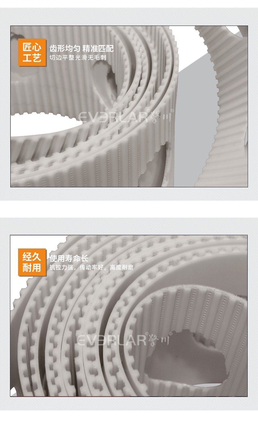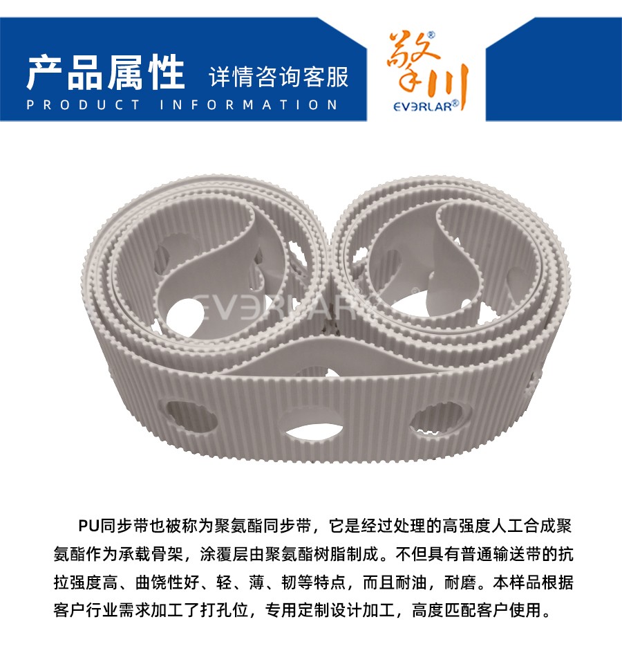 PU同步帶也被稱為聚氨酯同步帶,它是經(jīng)過處理的高強(qiáng)度人工合成聚氨酯作為承載骨架,涂覆層由聚氨酯樹脂制成。不但具有普通輸送帶的抗拉強(qiáng)度高、曲饒性好、輕、薄、韌等特點(diǎn),而且耐油,耐磨。本樣品根據(jù)客戶行業(yè)需求加工了打孔位,專用定制設(shè)計(jì)加工,高度匹配客戶使用。