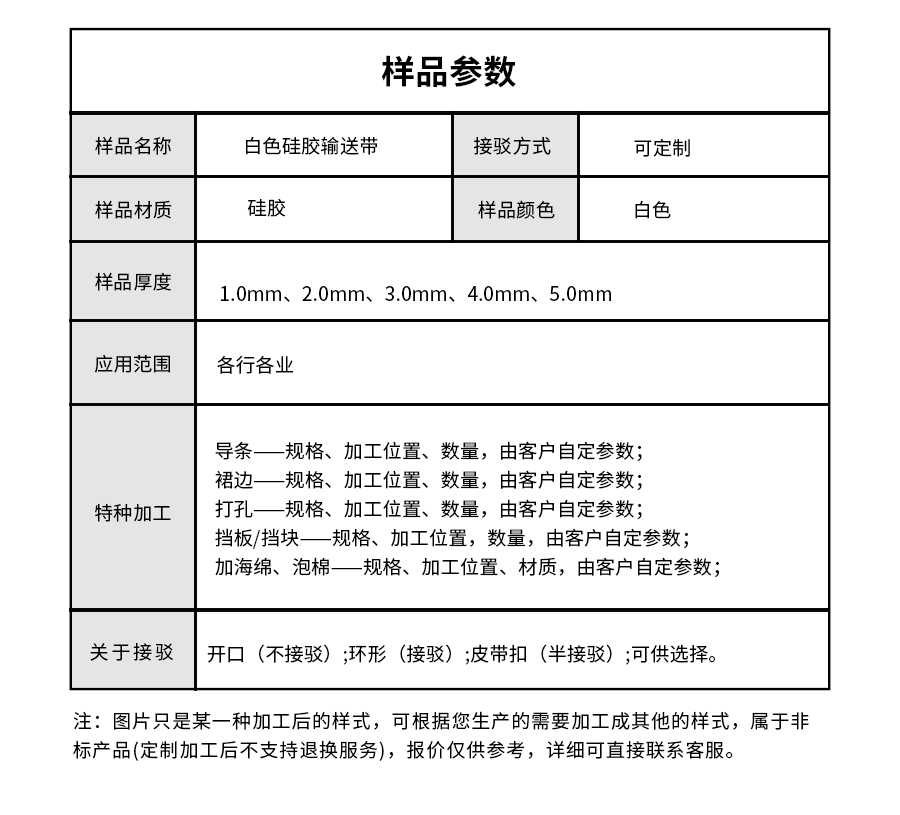 樣品名稱 | 耐高溫硅膠輸送帶 | 加工方式 | 按要求加工 |
