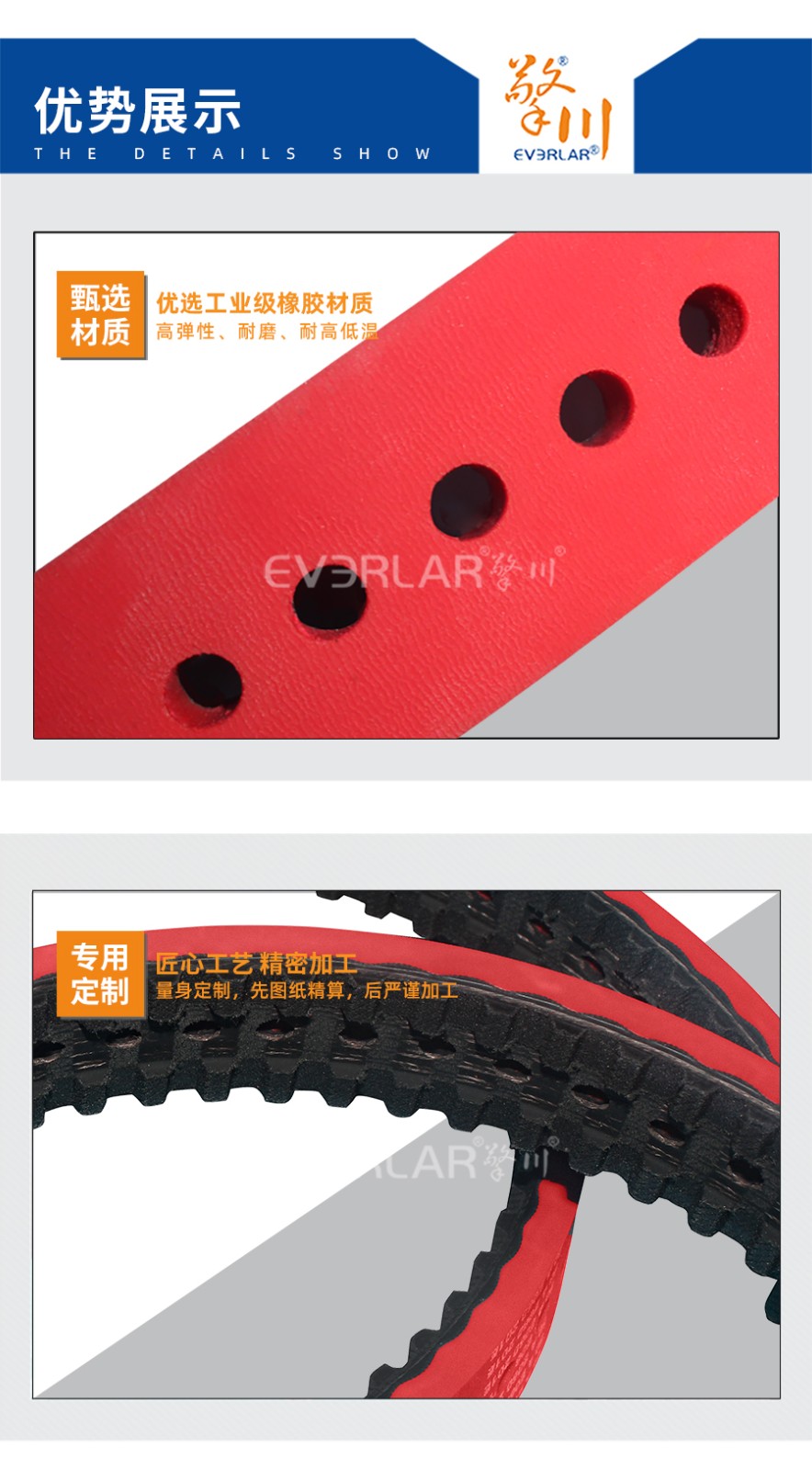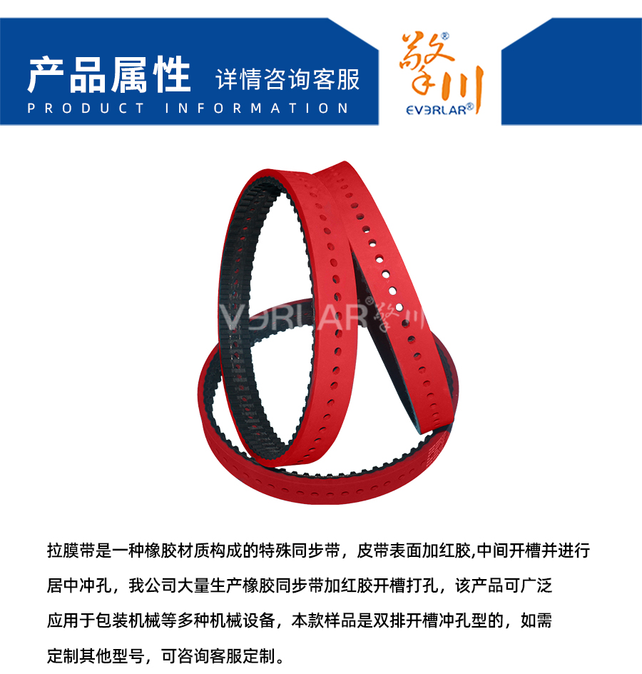拉膜帶是一種橡膠材質(zhì)構(gòu)成的特殊同步帶,皮帶表面加紅膠,中間開槽并進(jìn)行居中沖孔,我公司大量生產(chǎn)橡膠同步帶加紅膠開槽打孔,該產(chǎn)品可廣泛應(yīng)用于包裝機(jī)械等多種機(jī)械設(shè)備,本款樣品是雙排開槽沖孔型的,如需定制其他型號,可咨詢客服定制。