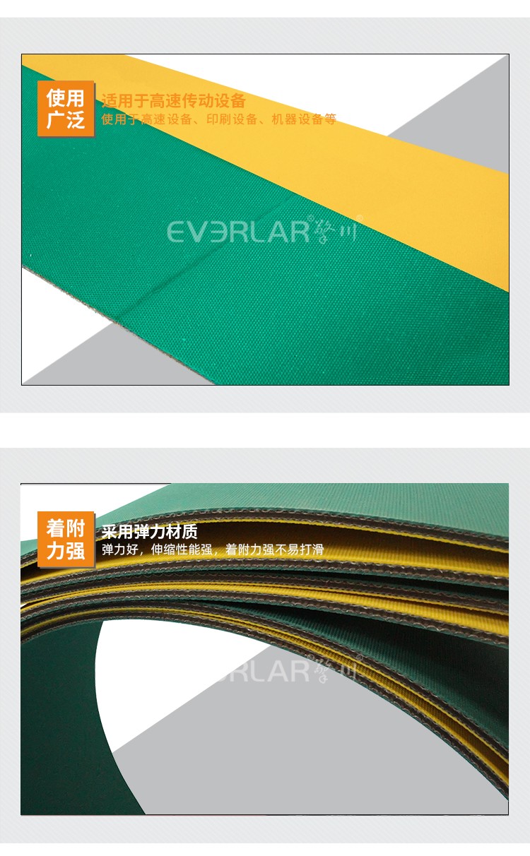 黃綠片基帶具有體質(zhì)量輕、強(qiáng)力高、使用伸長小、耐油耐磨性好、帶體柔軟、節(jié)能等特點:輕型輸送帶具有薄、軟、彈性好、伸長小、工作穩(wěn)定、使用壽命長等特點。