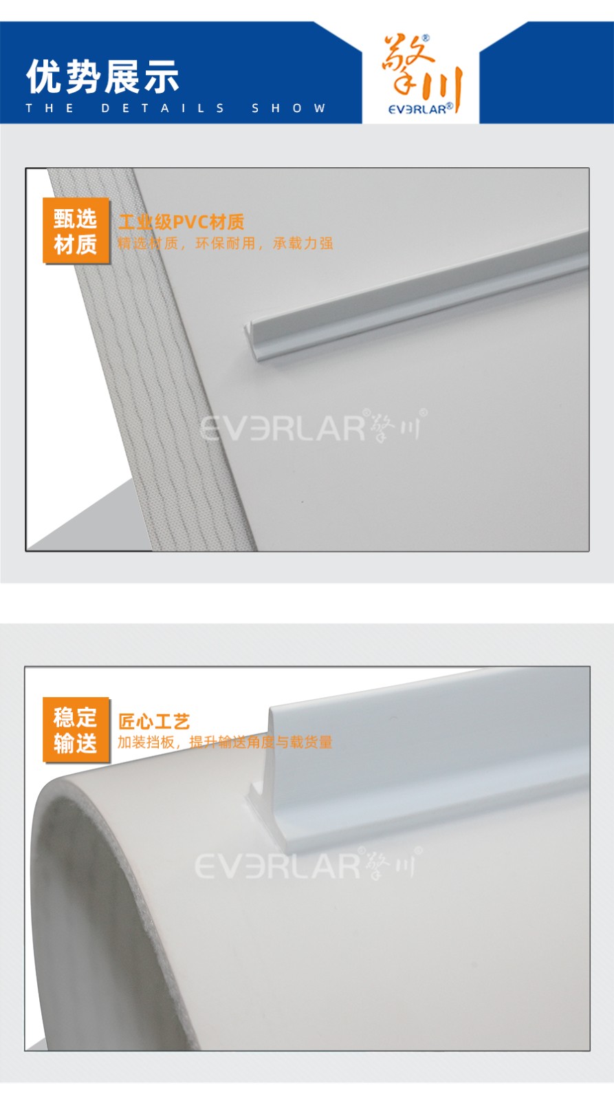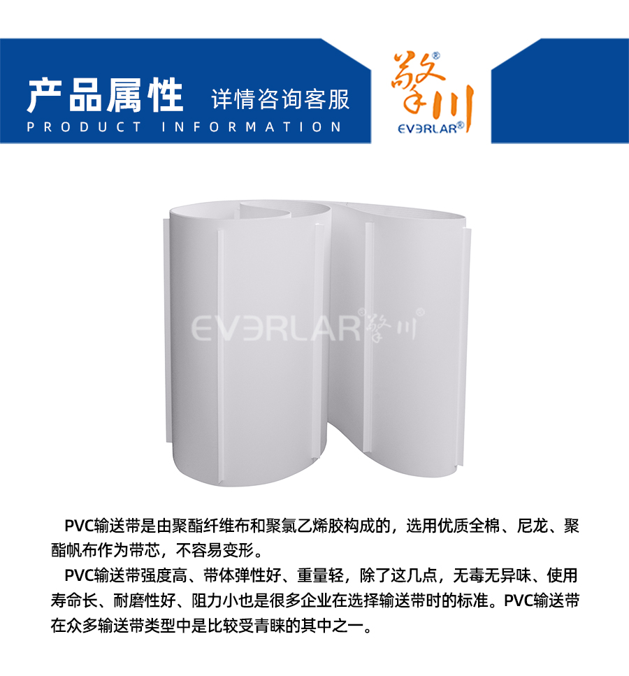 • 產品名稱:擎川everlar定制PVC輸送帶白色加擋板