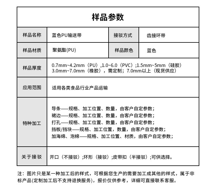 • 產(chǎn)品名稱:藍(lán)色PU輸送帶擎川食品輸送帶工業(yè)皮帶加工