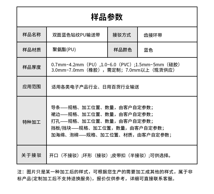 產(chǎn)品名稱:雙面藍(lán)色鉆紋PU輸送帶耐磨耐油食品級(jí)工業(yè)皮帶定制