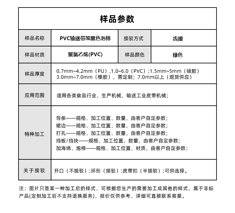 • 產品名稱:綠色PVC輸送帶加黑色泡棉耐磨耐腐蝕食品加工機械工業(yè)皮帶定制