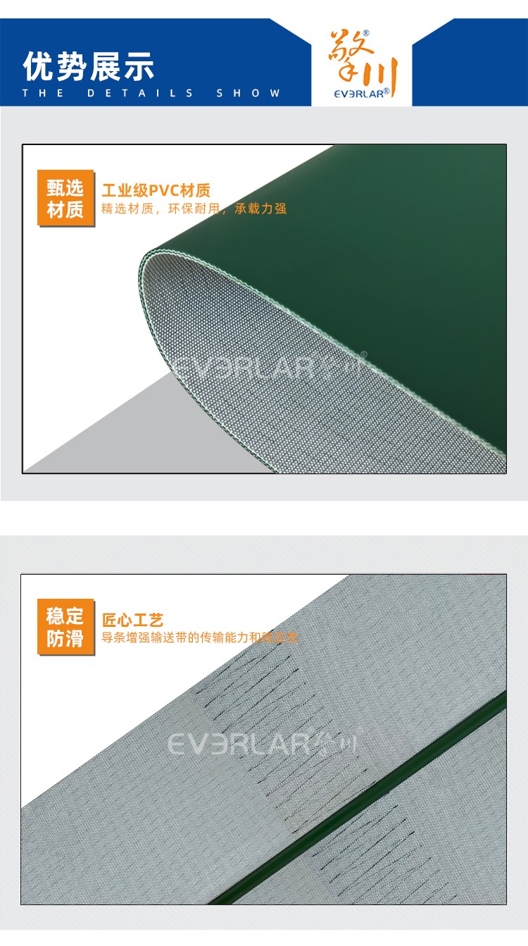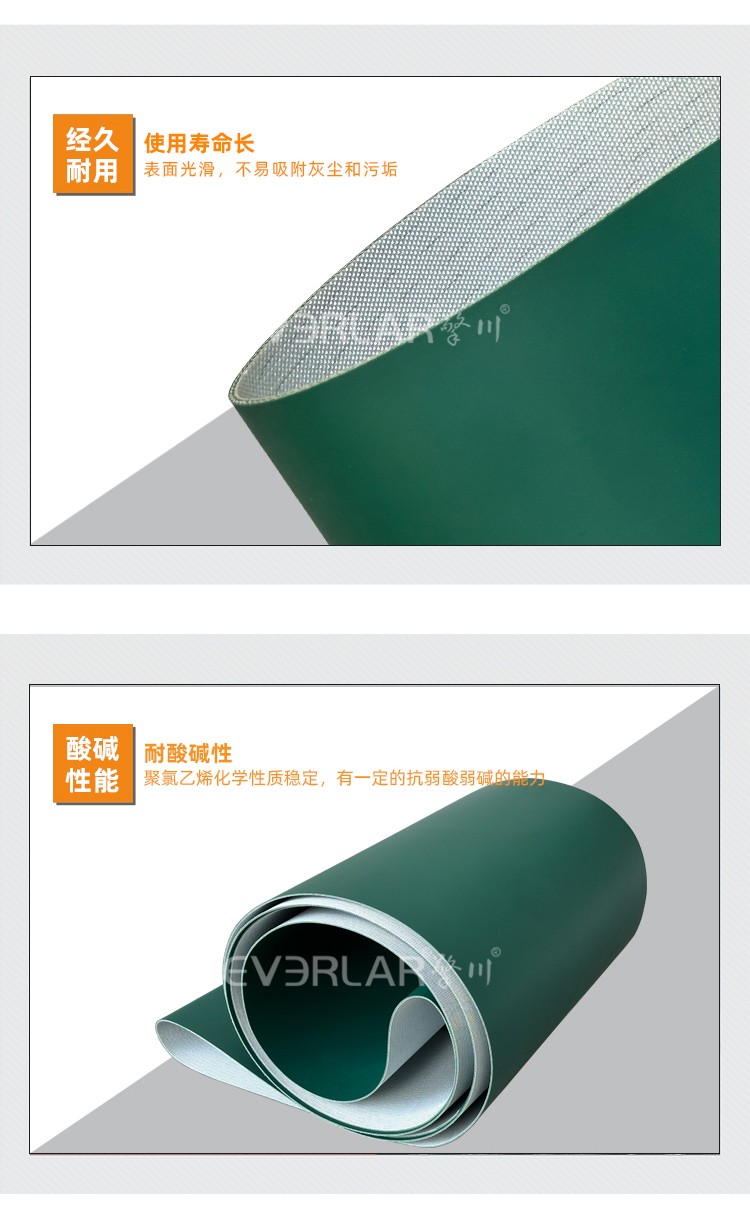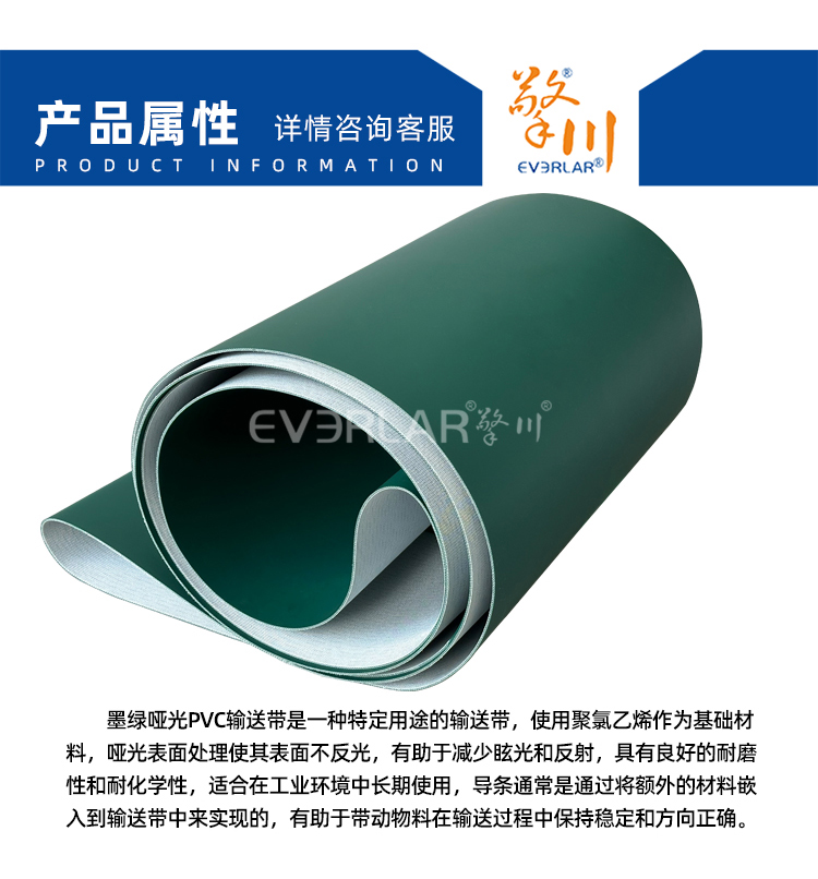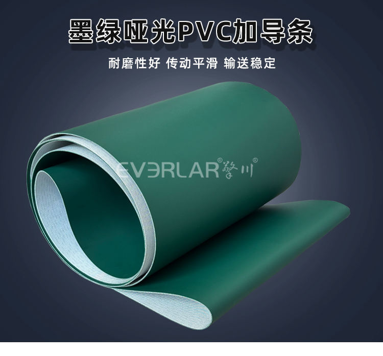 • 產(chǎn)品名稱:墨綠啞光PVC輸送帶加導(dǎo)條耐腐蝕防滑易清潔工業(yè)皮帶定制
