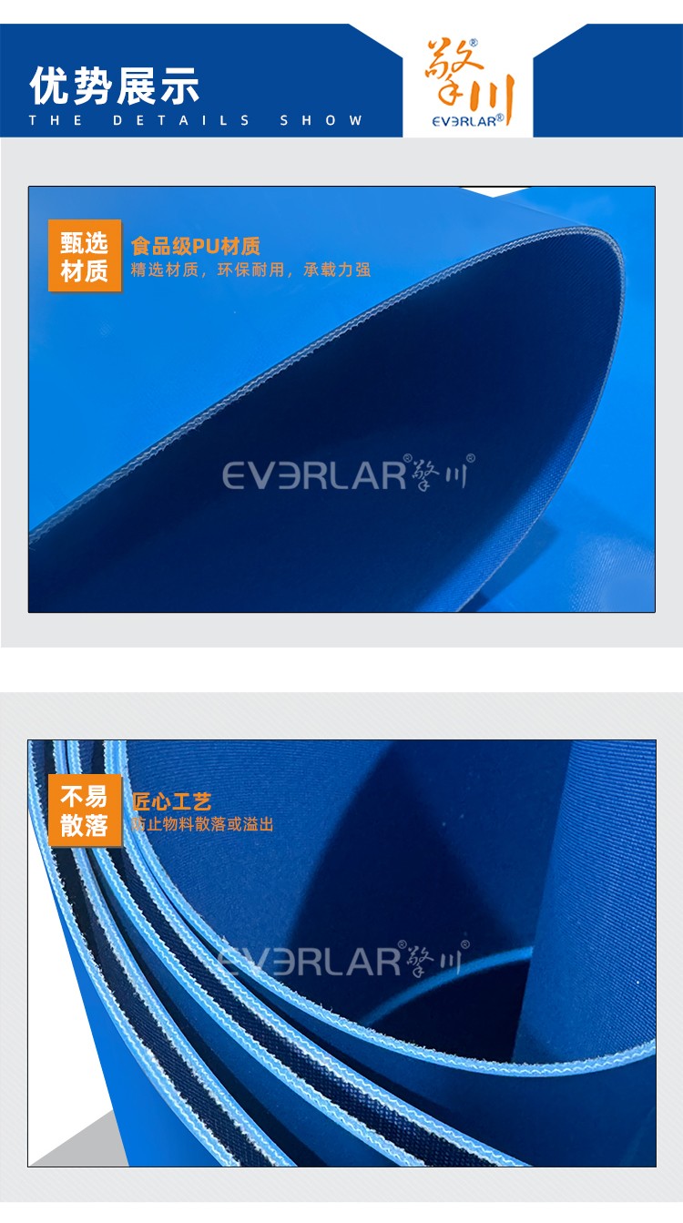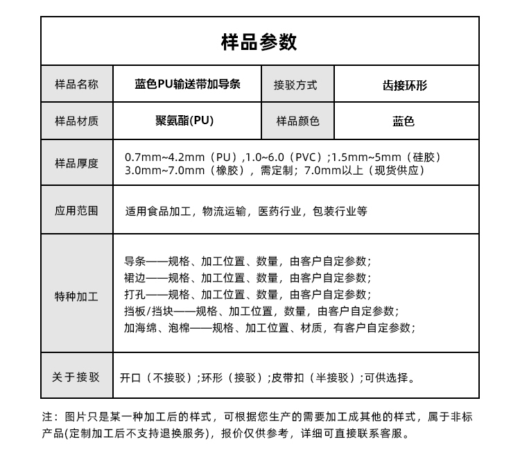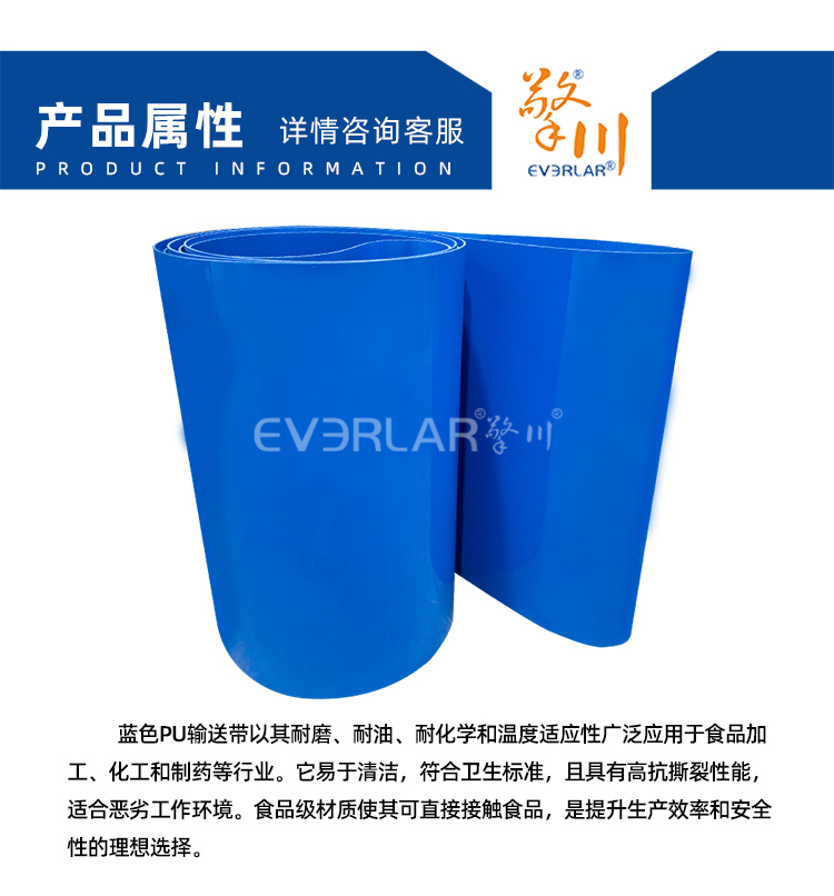 • 產品名稱:藍色PU輸送帶加導條耐磨耐油耐腐蝕工業(yè)皮帶定制