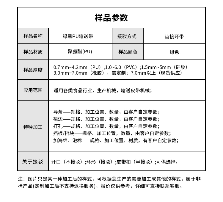 • 產(chǎn)品名稱:綠黑PU輸送帶耐磨耐切割耐腐蝕工業(yè)皮帶定制