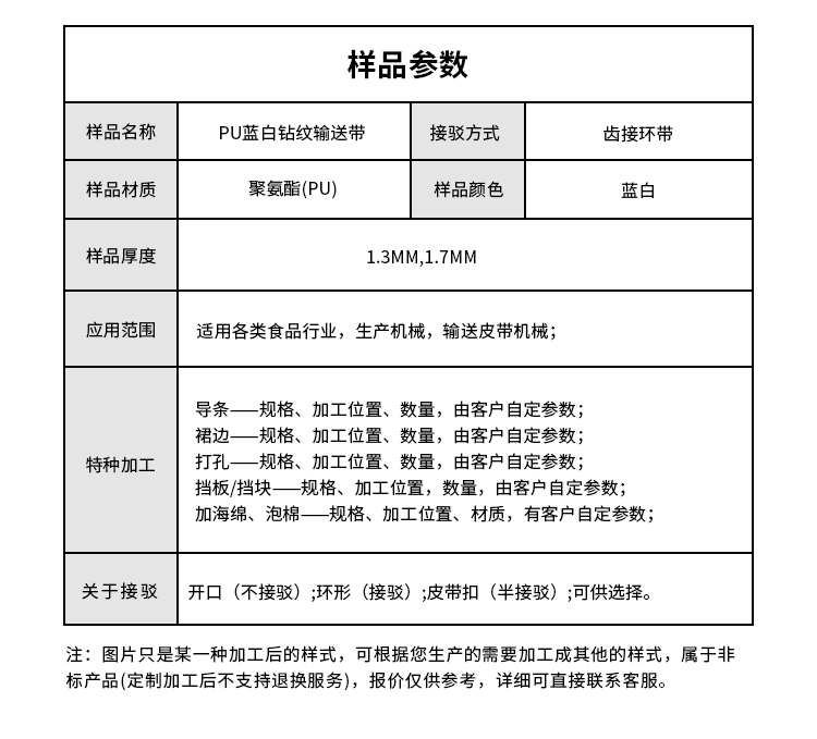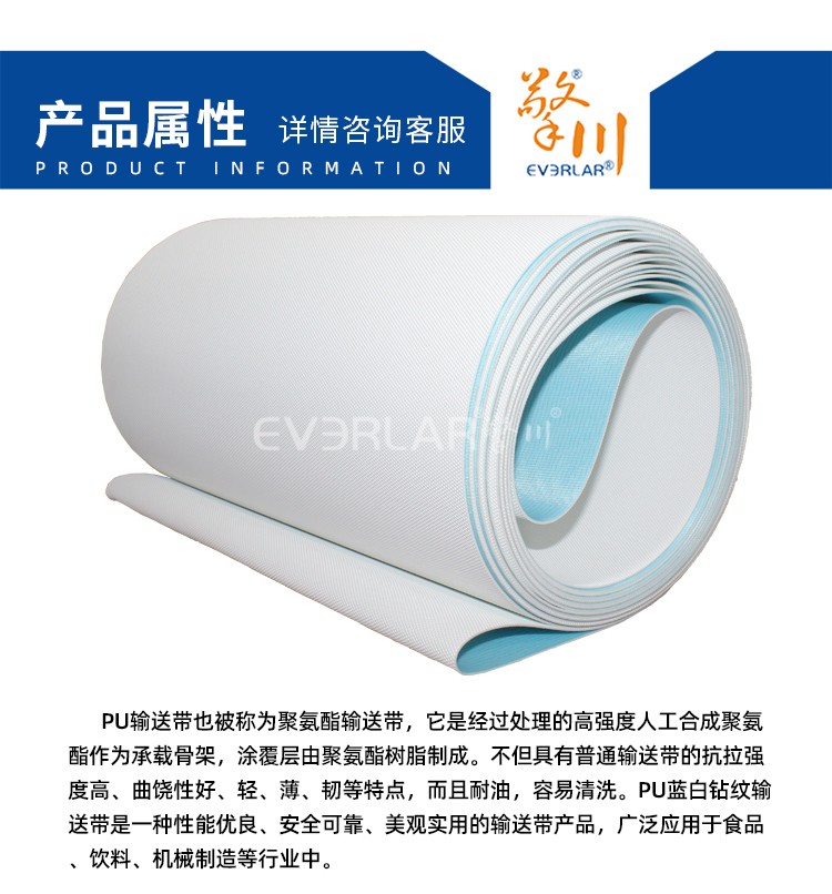 • 產(chǎn)品名稱:PU藍(lán)白鉆紋輸送帶耐磨耐油耐腐蝕工業(yè)皮帶定制