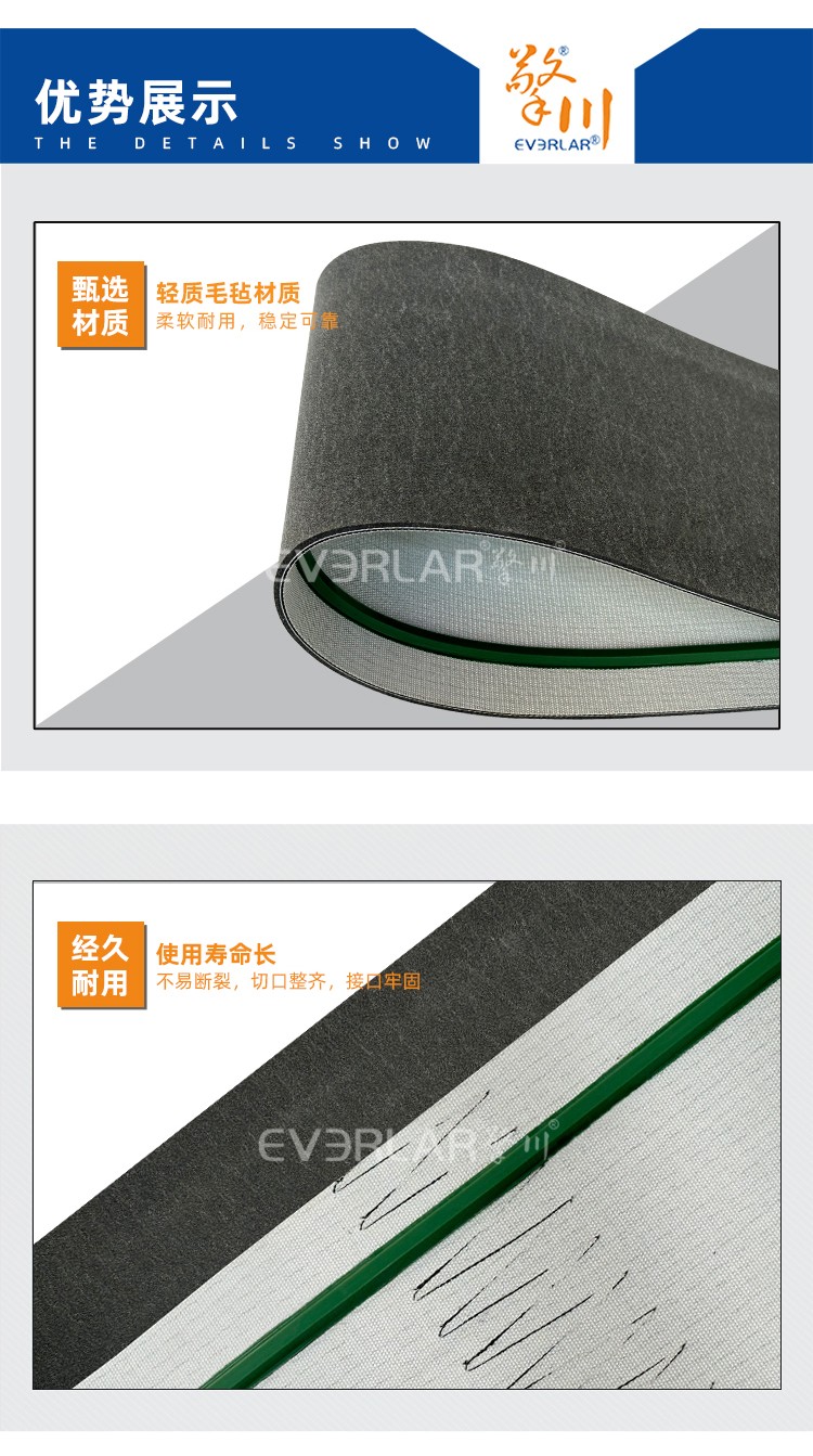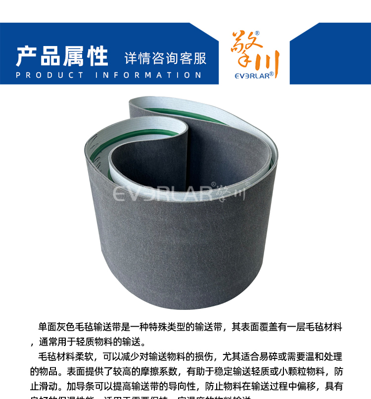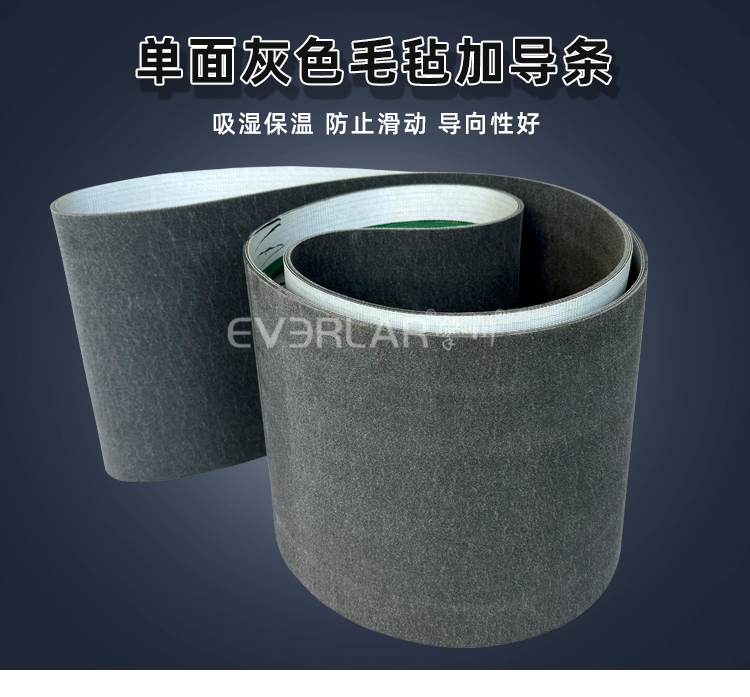 • 產(chǎn)品名稱:單面灰色毛氈加導條耐磨降噪平穩(wěn)工業(yè)皮帶