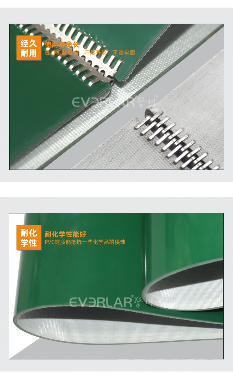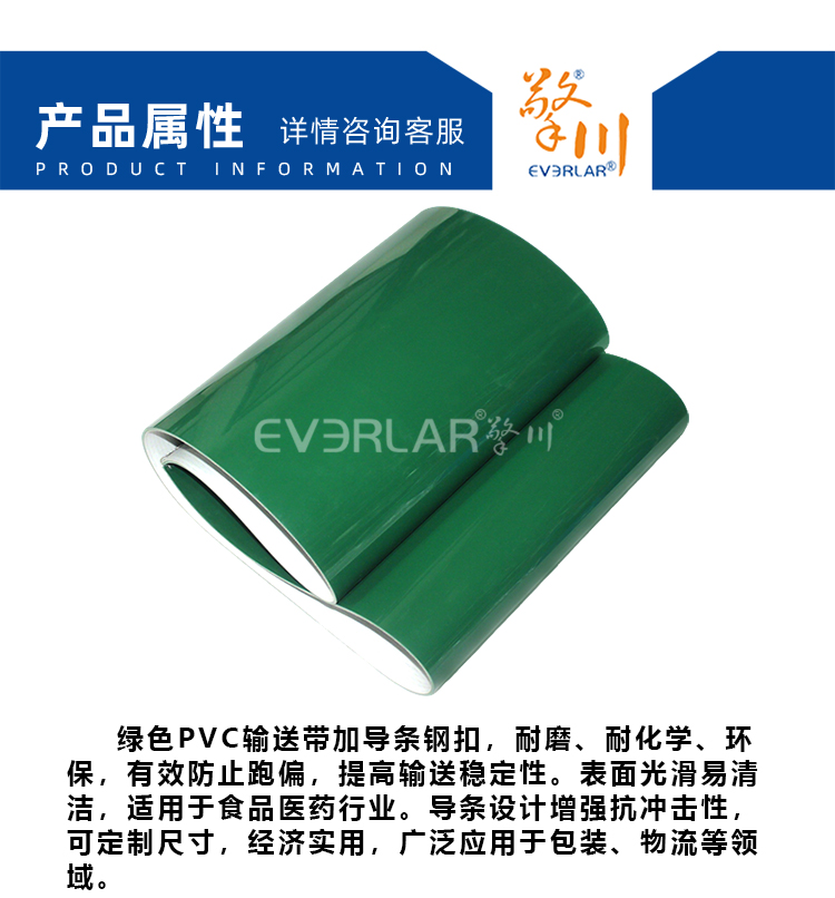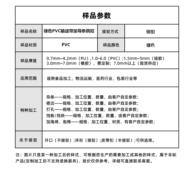 產(chǎn)品名稱(chēng):綠色PVC輸送帶加導(dǎo)條鋼扣防滑食品加工行業(yè)生產(chǎn)線皮帶定制