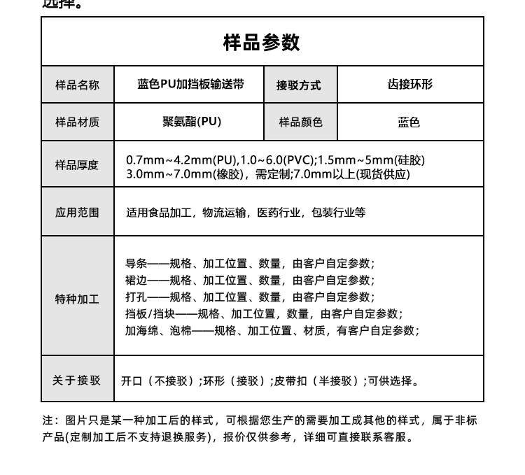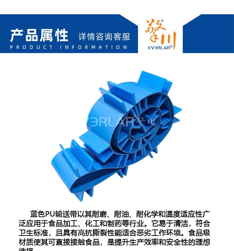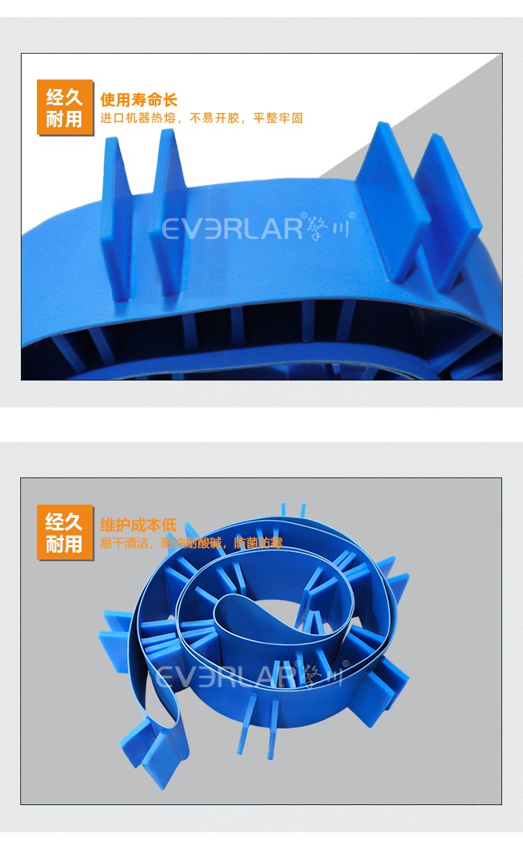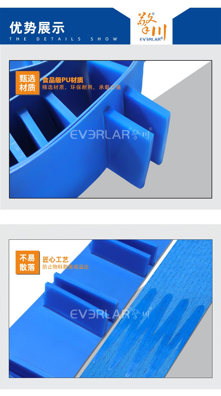 PU輸送帶加擋板導(dǎo)條耐磨防滑藍色食品級自動化流水線傳送帶定制