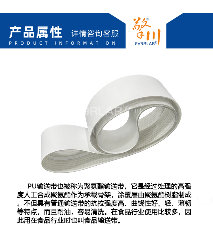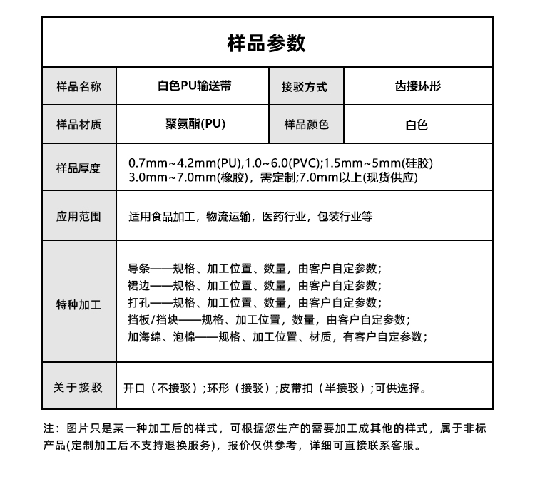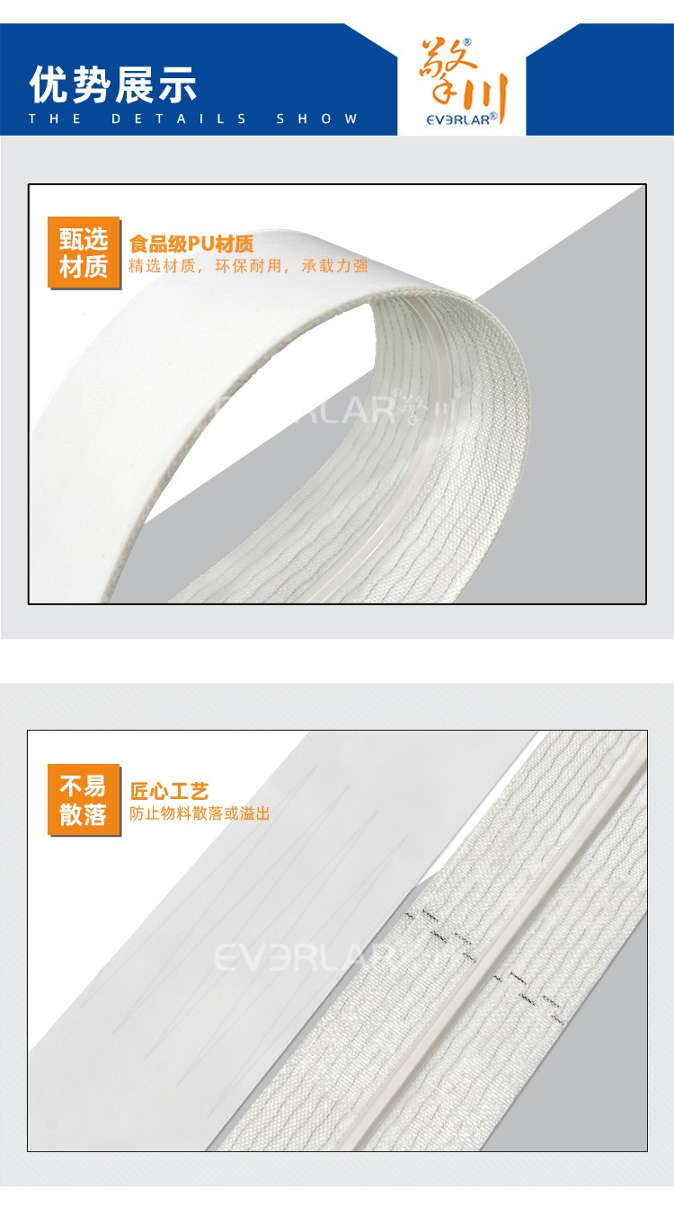 • 產品名稱:白色食品級PU輸送帶加導條耐磨耐油日化行業(yè)輸送機械皮帶加工定制