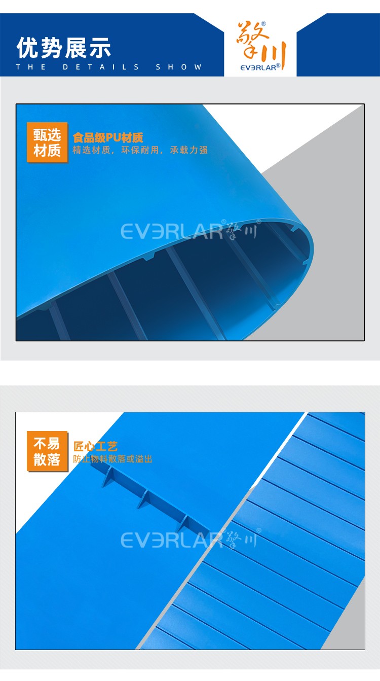 • 易清潔TPU加擋板輸送帶藍色食品級防溢抗污生產(chǎn)線設(shè)備傳送帶