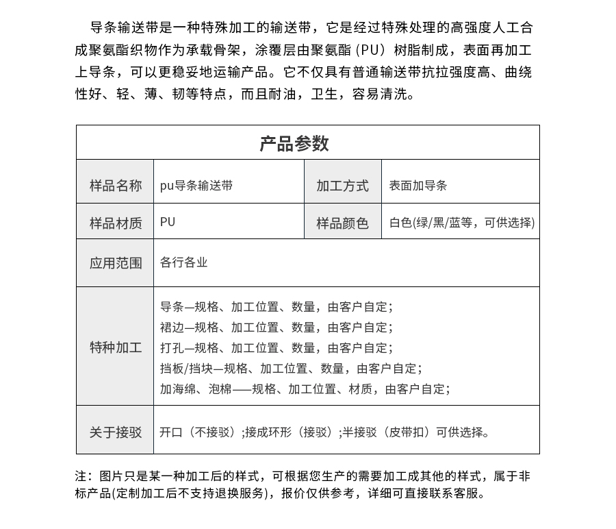 樣品名稱 | PU月餅輸送帶 | 加工方式 | 加導(dǎo)條 |