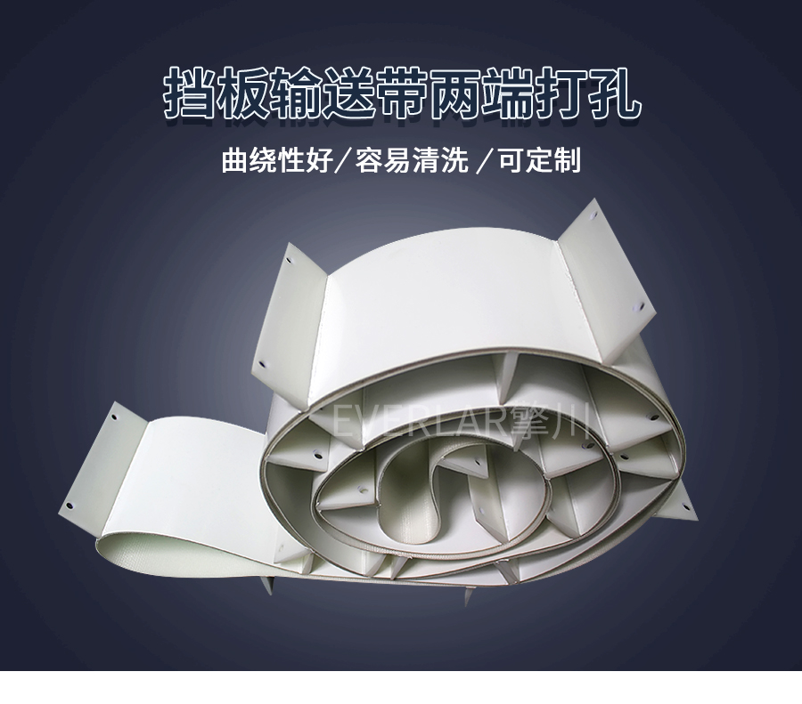 為食品、醫(yī)藥、包裝、日化提供一站式特殊定制從工廠到倉儲,PU輸送帶加擋板兩端打孔滿足多元輸送